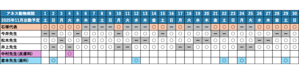 アネス動物病院25年11月の獣医師の出勤予定です。
