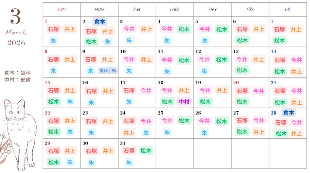 3月の獣医師の出勤予定です